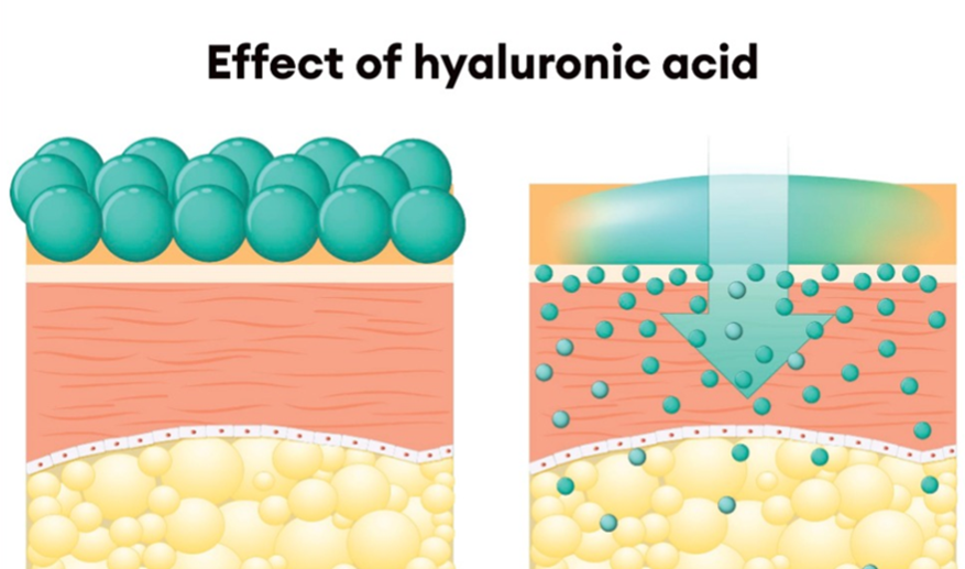 High molecular weight HA primarily forms a film on the surface of the skin (left), while low molecular weight HA penetrates more into the inner layers of the skin and thus contributes to its nutrition.